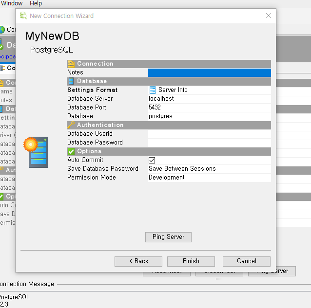 마지막으로 넘어가면 이제 Connection에 대한 정보를 입력하는데가 나오는데 나는 AWS에 올라가있는 디비와 연결해야해서 해당 주소를 넣고 유저 아이디와 비밀번호를 입력했다. Finish 버튼을 누르기전에 Ping을 한번 해주자!