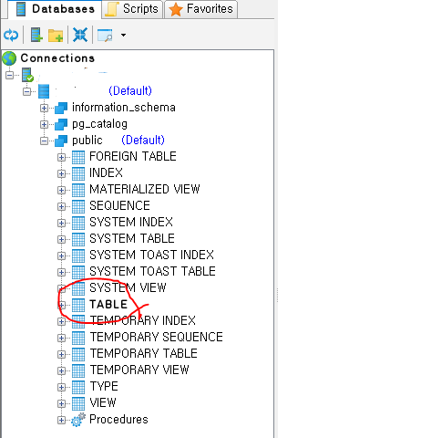 이제 왼쪽탭에서 연결된 디비를 눌러보면 아래에 TABLE이라는 녀석이 있다. 얘를 클릭해보자.