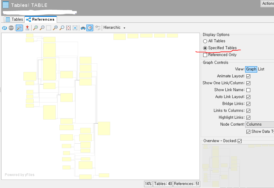 클릭한 후 오른쪽을 보면 Reference라는 탭이 뜨는데 여기 들어가면 일단 모든 테이블을 다 그려준다.