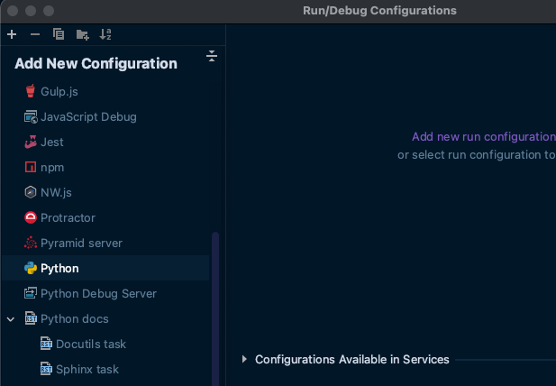 위에 기술한대로 Flask 개발을 할것이고, 이와 관련된 변수를 넣을 예정이다. Configuration 화면에서 왼쪽 상단의 + 를 누르고 아래로 내리면 Python이 보이는데 이걸 클릭해보자.