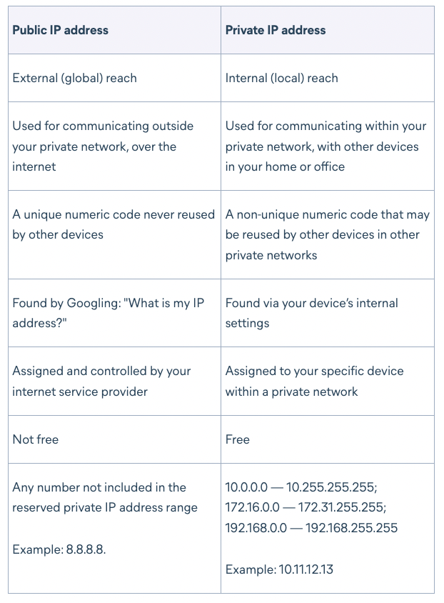 둘의 가장 큰 차이는 얼마나 멀리 도달하는가와 어디에 연결되는가에 있다. 공인 ip주소는 거대한 인터넷속에서 당신을 식별하는 것으로 당신을 찾을 수 있는 모든 정보를 담고 있다. 사설 ip주소는 사설 네트워크상에서 안전하게 다른 장치와 연결되는데에 사용된다.