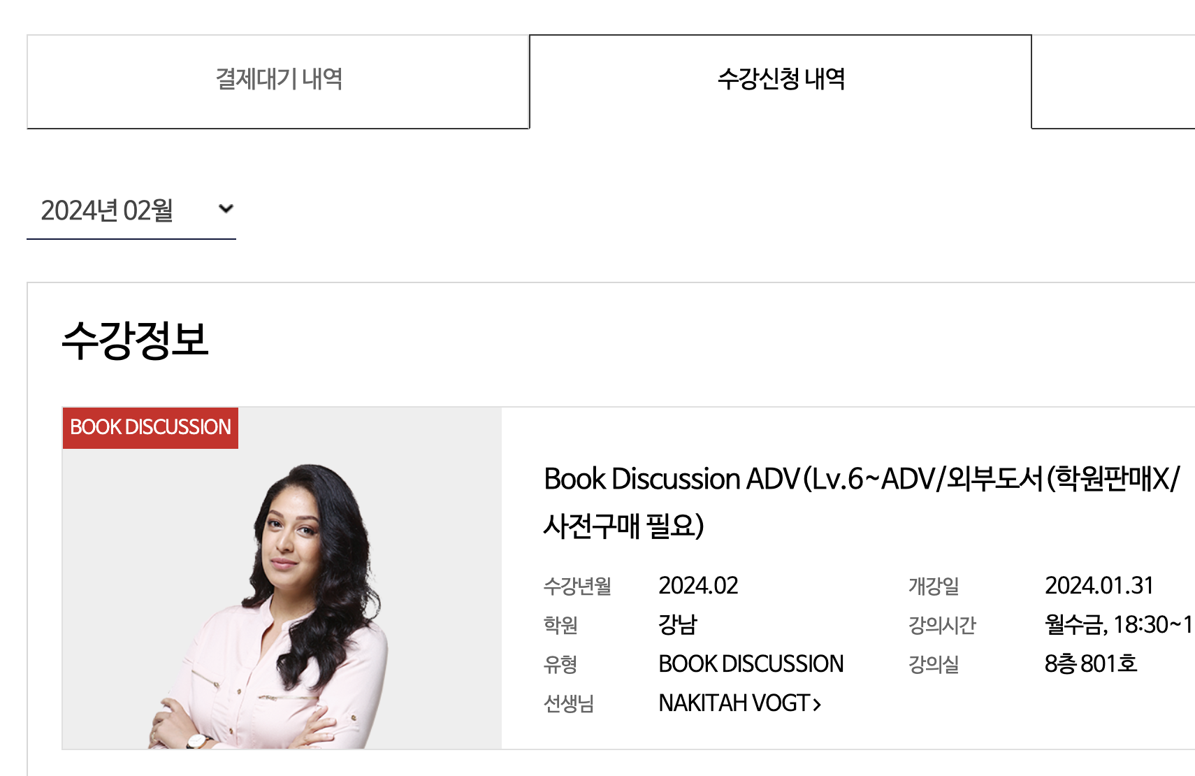 나의 경우엔 월수금 저녁 타임 수업인데 금은 격주로 수업이 있고, 월수는 고정이다.