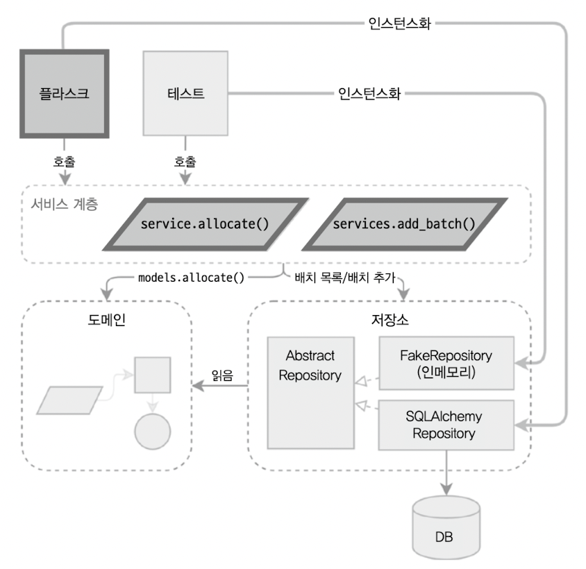 - 플라스크로 allocate 도메인 서비스 앞에 API 엔드포인트 위치. 데이터베이스 세션과 저장소 연결. 엔드투엔드 테스트와 빠르게 만든 몇가지 SQL 문을 활용해 테스트