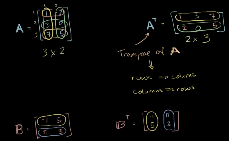 - row는 column이 되고, column은 row가 되는 것을 의미 → 즉, ij 위치의 요소는 ji의 위치로 간다!