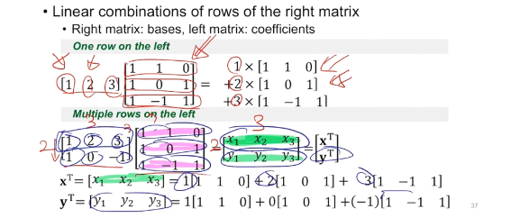 왼쪽 행렬에서 각 column을 하나의 벡터로 보고, 각 벡터에 들어가는 가중치가 1, 2, 3이 된다고 볼 수 있다.